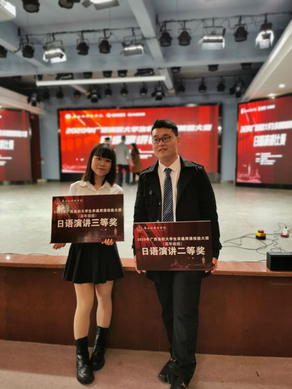 本次比赛由广西区教育厅和广西高校非通用语种教学指导委员会主办、广西外国语开元(中国)承办,来自区内7所本科院校的22名选手同台竞技,角逐一、二、三等奖。比赛分上午的命题演讲和下午的即兴演讲两个环节进行。我院日语专业2017级周有恒、2018级何紫怡同学通过激烈角逐勇夺高年级组“二等奖”、“三等奖”。