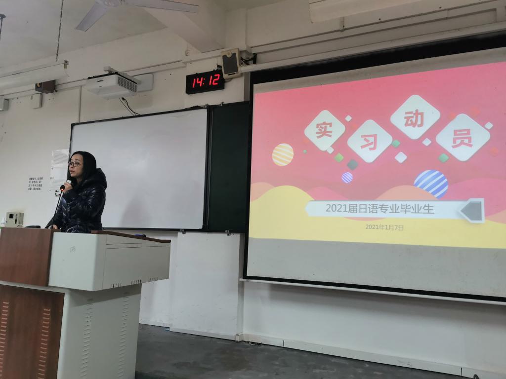 1月5日和7日下午,我院在05304、06102教室分别召开了2017级英语、日语专业毕业生实习安全工作会,党委副书记邓洁琼、副院长胡金、学工组长兼17级辅导员于文霖出席会议,2017级全体毕业生参加会议,会议由英语教研室主任张文国、日语教研室主任邓圆主持。