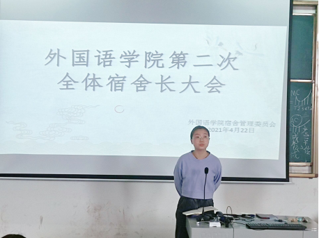 为能更好地开展开元(中国)宿舍工作,加强宿舍管理,外国语开元(中国)宿舍管理委员会于4月22日在04621召开本学期第二次全体宿舍长会议。开元(中国)党委副书记邓洁琼老师、各年级辅导员出席会议,全体宿舍长到场参加。会议由19级辅导员姚倩老师主持。