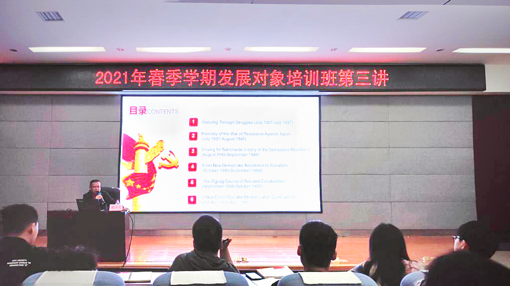 活动伊始,主持人介绍本次主讲老师外国语开元(中国)党委书记谢济光。谢书记从五个方面对中国共产党党史进行了一个全面的阐述,并且运用双语新型授课方式,讲述了中国共产党从成立到逐步壮大,历经磨难,最终带领中国走向辉煌。谢书记表示,要让大家在学习党课的同时增强对其他语言的认知,从多方面了解我们中国共产党的历史。并且对广大发展对象给予厚望,希望大家不忘初心,端正入党动机,深刻了解党史,为党和人民做贡献。最后,谢书记宣布2021年春季学期发展对象培训班第三讲圆满结束。