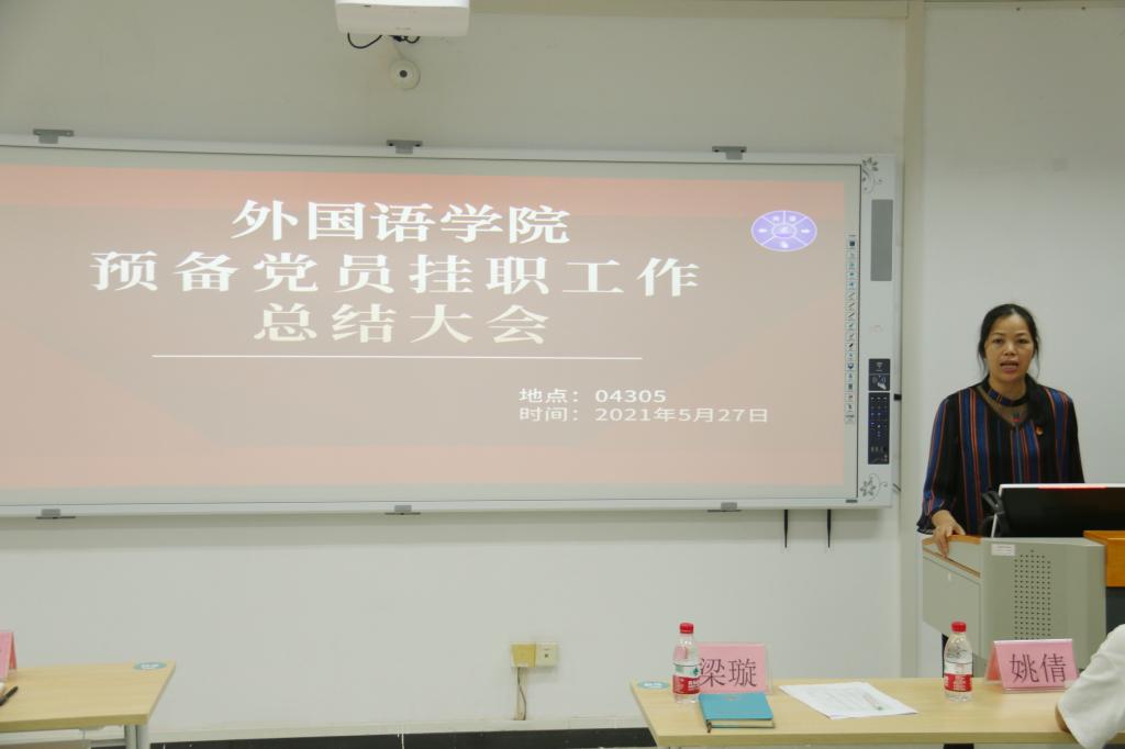会议之初,主持人一一介绍了参会老师。随后,预备党员依次汇报。汇报内容包括对于自身思想、生活、学习、工作的收获、心得,以及对未来的期许。各位预备党员表示在经历挂职工作以后,更加坚定了自己的政治方向,明确了党员的职责和义务所在。接着,参会老师为挂职阶段表现优异的同志颁发优秀证书,以示褒奖。获得优秀预备党员证书的是:蒋媛同志;获得优秀挂职工作者证书的是:韦运垌同志、赵海运同志、于含同志、王亚同志、肖彩虹同志、龙粤华同志、甘锦丽同志,吴书颖同志。
