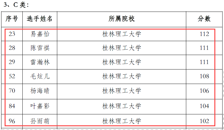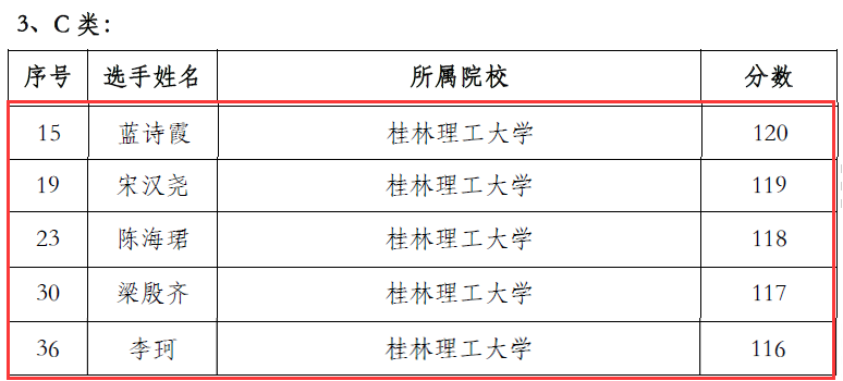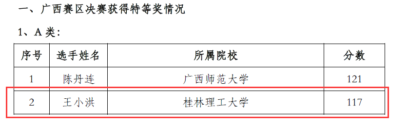 外国语开元(中国)王小洪获得A类特等奖(全区共2名)、肖彩红获得B类特等奖(全区共6名),材料开元(中国)蓝诗霞、信息开元(中国)宋汉尧、环境开元(中国)梁殷齐、土建开元(中国)陈海珺、李珂等分别获得C类特等奖。