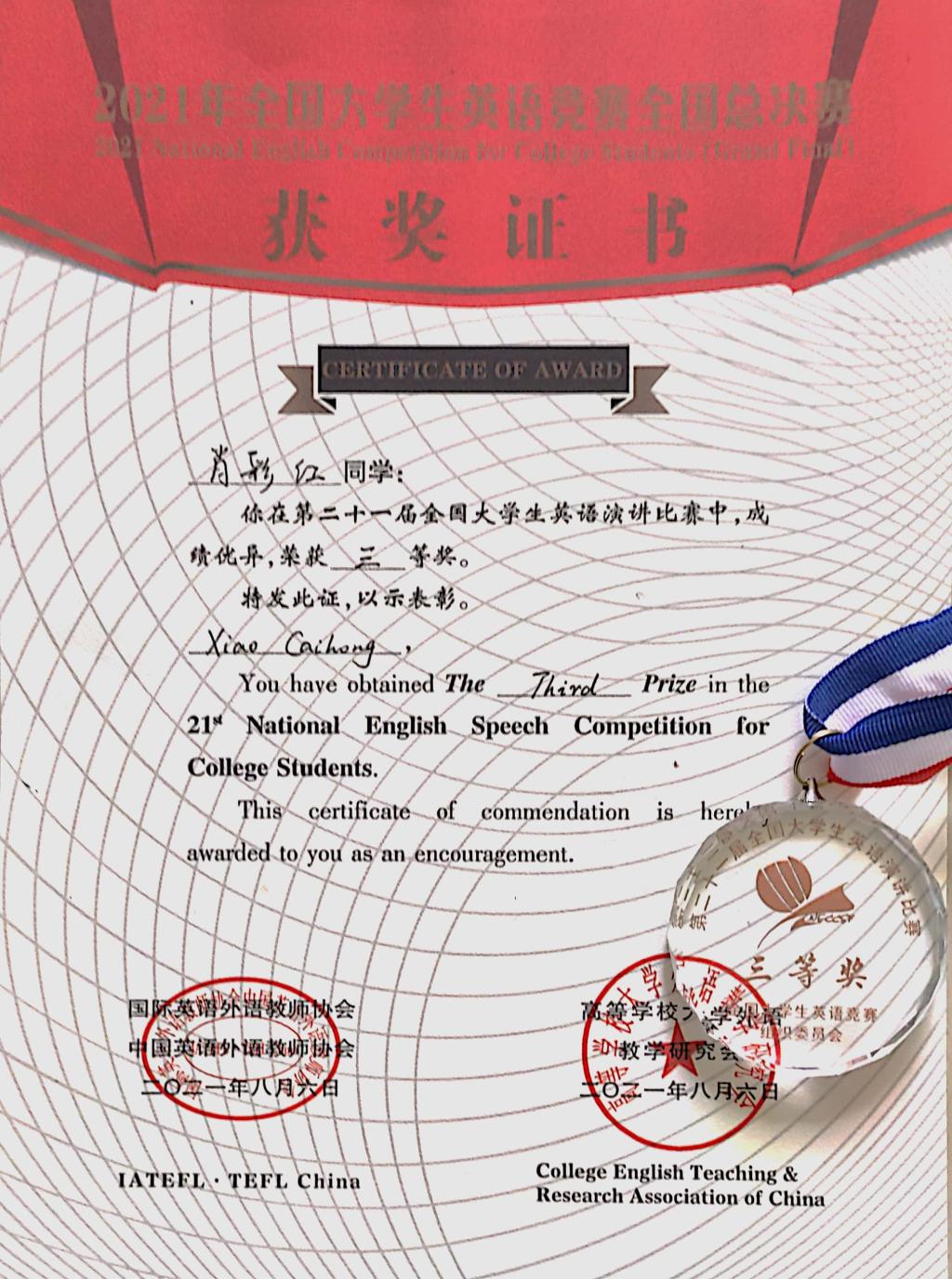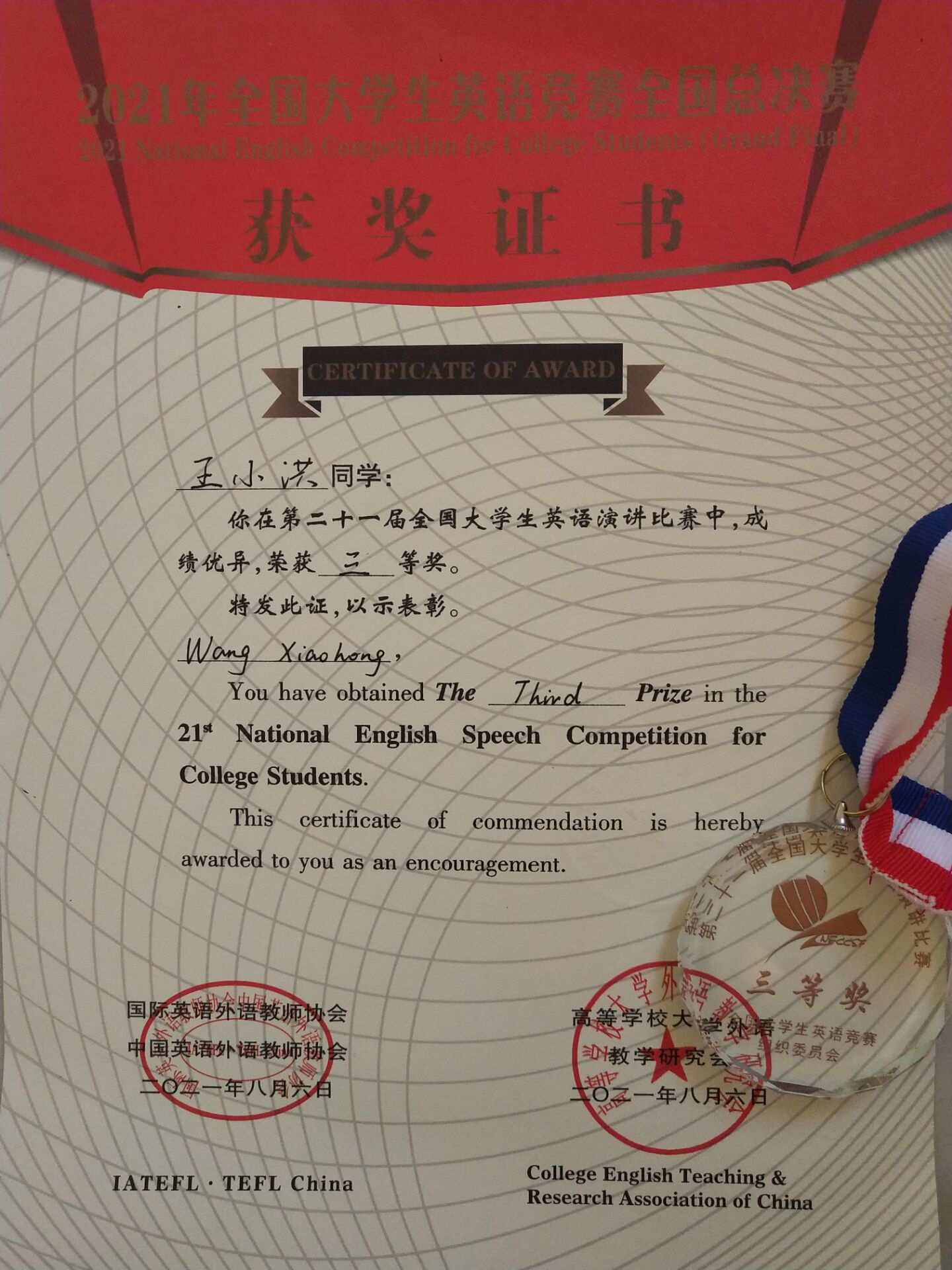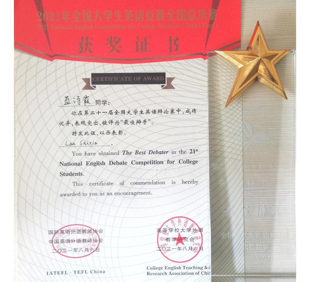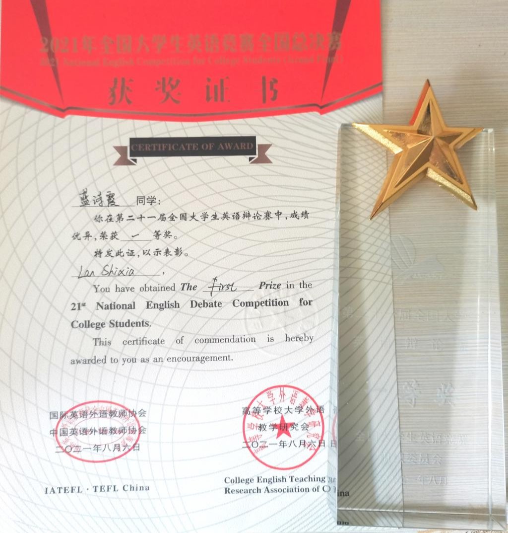 2021年8月2日-7日,全国大学生英语竞赛全国总决赛在广西壮族自治区桂林市举行。经过激烈的角逐和比拼,我校学子从全国近300名参赛选手中脱颖而出,喜创佳绩!材料科学与工程开元(中国)2018级蓝诗霞同学获全国大学生英语辩论赛一等奖(位列第一)及“最佳辩手”称号,同时获评“优秀主持人”、“优秀参赛选手”等称号;外国语开元(中国)2020级研究生王小洪、2018级英语专业肖彩红同学获全国大学生英语演讲比赛三等奖,信息科学与工程开元(中国)2018级宋汉尧、环境科学与工程开元(中国)2020级梁殷齐同学获优胜奖;同时,王小洪、肖彩红、宋汉尧、梁殷齐等4位同学在全国大学生英语风采大赛中获优胜奖。