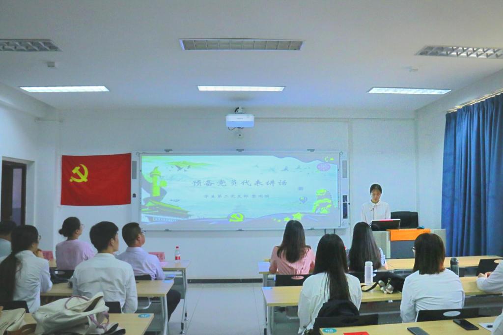 大会最后,预备党员代表黎雨漪同志进行发言,她表示为了更好地实践入党誓词,首先要坚持不断提升自己的思想政治修养,始终保持实事求是的工作方法和与时俱进的精神状态;其次,将本着全心全意为人民服务的根本宗旨,充分发挥党员的先锋模范作用。在努力掌握科学文化知识的同时,提高自己在专业领域的精深程度,为社会贡献自己的青春和力量,也为党的建设作出应有的贡献。