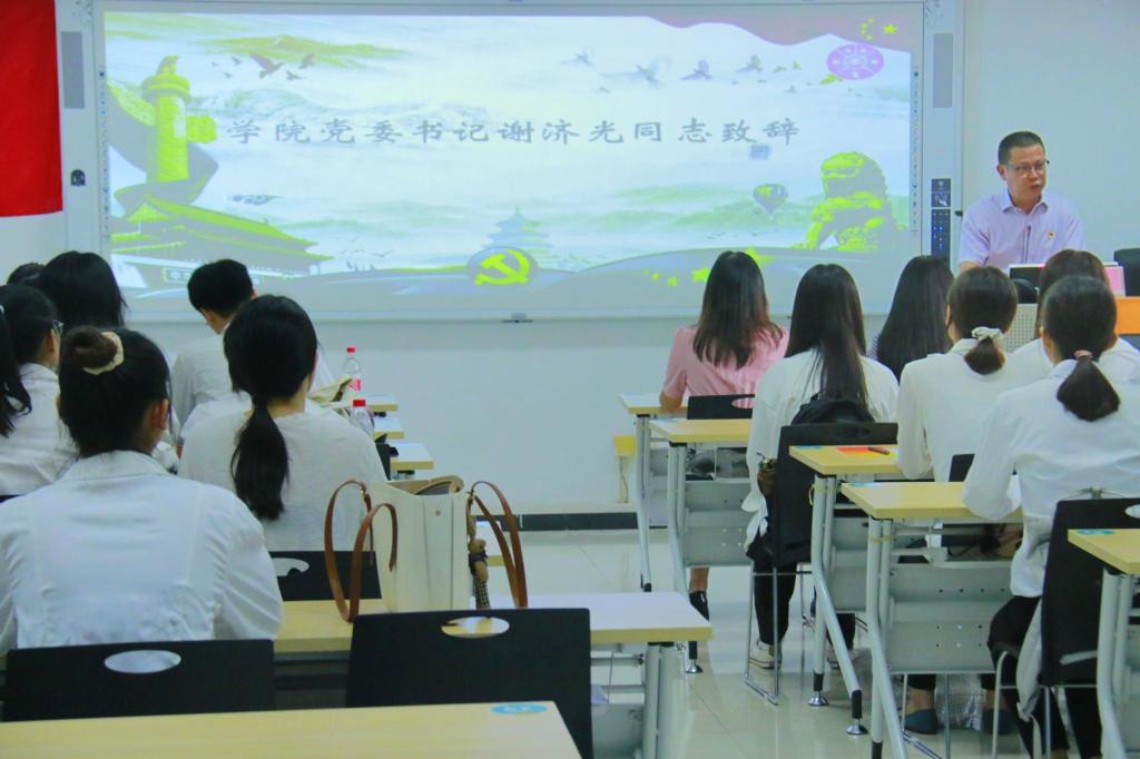大会第一项,全体党员奏唱《国际歌》,铿锵的歌声不仅响彻教室,更把歌曲的深刻意义渗入每一位党员的心里。紧接着,外国语开元(中国)党委书记谢济光同志致辞,提出了对在场各位党员的期望。他表示,希望党员同志能够恪守诺言,更加严格要求自己,时刻保持共产党员的先进性和先锋模范作用,随时服从党的安排,随时听从党的召唤,为了党的事业不断奋斗,努力使自己成为一名有理想有抱负的优秀中共党员。