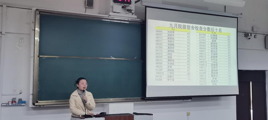 首先,姚倩老师通报了9月份各年级宿舍内务的总体情况、每日未按时确认群公告的宿舍晚汇报情况以及近期校级宿舍检查中存在的违规情况。接着,邓洁琼老师讲话,她强调了宿舍晚汇报、禁止使用违规电器等管理制度,并鼓励宿舍长与宿舍成员齐心协力,共同打造安全、良好的宿舍环境。最后,邓洁琼老师积极引导同学们提高自我防范意识,经常自检自查,自觉做好宿舍日常安全隐患排查。