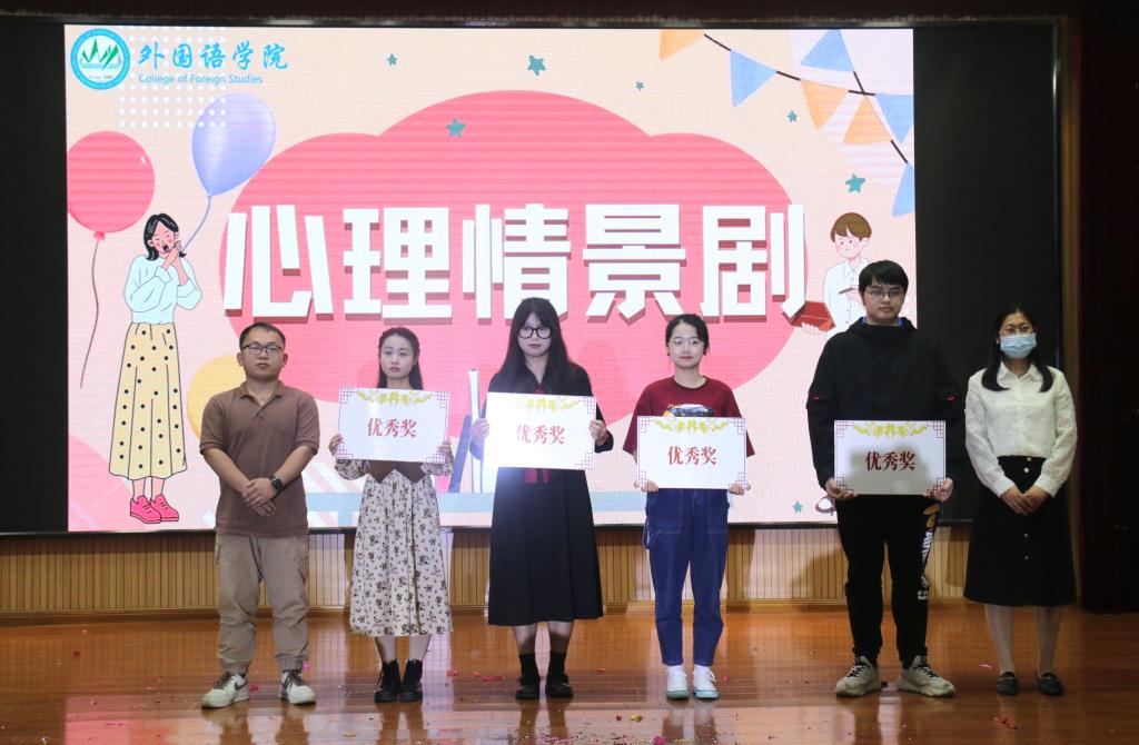 大赛开始前,主持人向观众详细介绍了本次大赛设置的奖项和评比方式。随后,精彩紧张的心理情景剧大赛拉开帷幕。在排练和表演的过程中,演员们在合作中增进友谊,认真感受角色的心情,用精湛的演技演绎出人物的内心世界。各具特色的节目生动形象地展示出现实生活中大学生们遇到的心理问题,赢得了热烈掌声。观众们在情景剧的戏剧化表达中感悟解决心理问题的办法,享受了一场视觉和心理上的盛宴。同时,比赛中途还进行了心理知识问答环节,在场观众们积极回答问题,将现场气氛推向高潮。最后,李海亮老师在大赛尾声进行节目点评。他指出节目有多彩、精彩、出彩等特色,给出高度评价。同时呼吁老师和同学们关注心理健康,呼吁更多的同学参与到心理情景剧的创作中,让心理情景剧大赛越办越好。至此,本次大赛完美落下帷幕。此次比赛中,英语19-6班的《伪装者》获得一等奖,由邓洁琼老师颁奖;英语20-6班《聊“灾”致“抑”》、英语21-4班《心灵之旅》、英语21-6班《我不是半兽人》获得二等奖,由李海亮老师颁奖;英语21-5班《山茶花开》、日语20-3班《拒绝PUA,理性恋爱》、英语21-2班《和我们在一起》获得三等奖,由刘金良老师和肖梦洁老师颁奖;英语20-4班《向拖延说漏》、英语20-3班《第一名》、英语21-1班《交换》、英语20-5班《梦想之下》获得优秀奖,由王好男老师和李云老师颁奖。