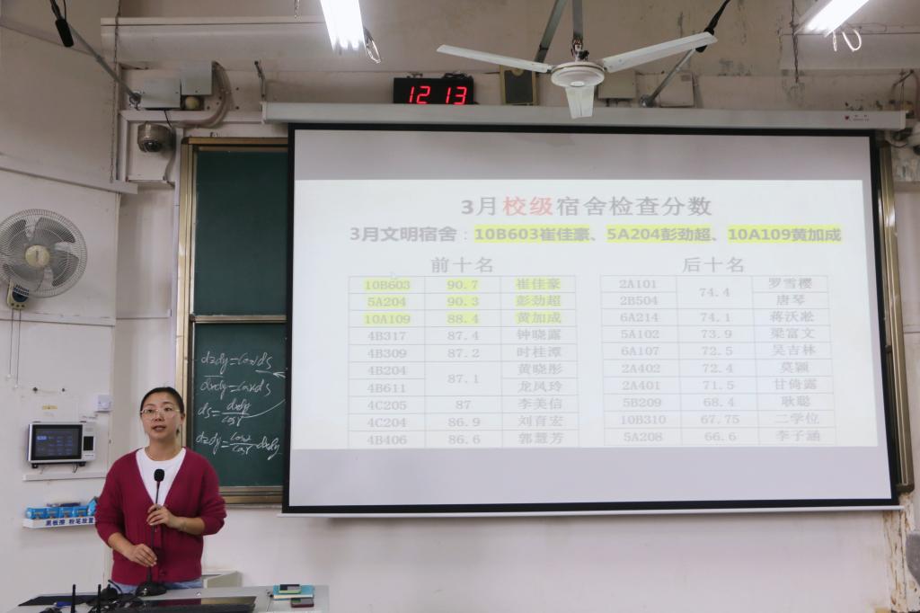 首先,姚倩老师对三月份获得校级“文明宿舍”表彰的三个优秀宿舍提出表扬,公布了四月份各年级宿舍内务的总体情况、四月份宿舍消杀活动中的安全隐患检查结果、每日未按时确认群公告的宿舍晚汇报情况以及近期院、校级宿舍检查中存在的违纪违规情况。并对党员联系宿舍活动进行强调,明确了宿舍长需与宿舍成员强调积极同党员交流的要求。