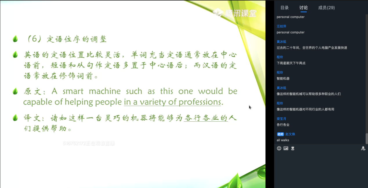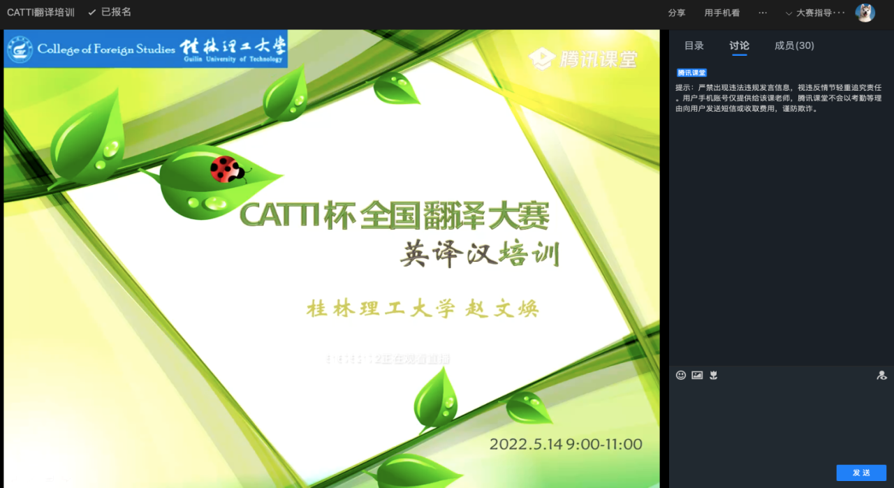2022年5月14日上午9:00-11:00,“CATTI杯”全国翻译大赛指导教师赵文焕老师在腾讯课堂平台为学生开展线上英译汉培训活动,凌琳老师则负责收集整理各参赛选手在培训过程中及准备过程中的疑问,进行线下答疑工作,并在群内分享备赛资料(课件或练习)、进行实例讲解,为各参赛选手答疑解惑。