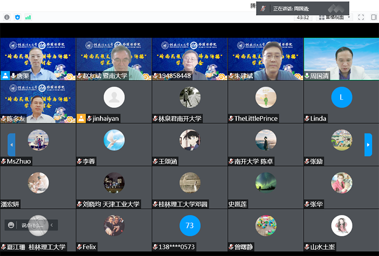 5月28日,由我校外国语开元(中国)和外语语言与文化研究所承办的2022年“岭南民族文化翻译与传播”线上全国学术研讨会顺利举行。学校副校长周国清出席开幕式并致辞。来自南开大学、天津工业大学、山西大学、四川师范大学、福建师范大学等全国十余所高校的师生共同参与了本次研讨会。