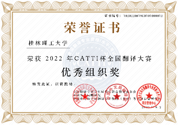 桂林理工大学也荣获2022年CATTI杯全国翻译大赛优秀组织奖。