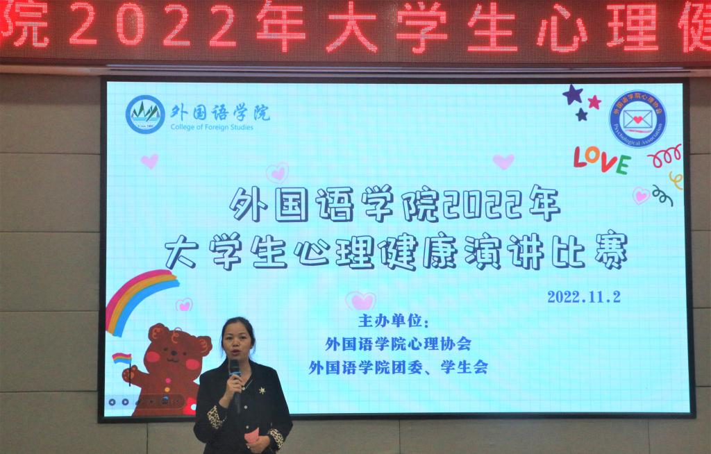 为提升大学生们对精神卫生知识的掌握,推进素质教育,加强和改进学生心理健康工作,我院于2022年11月2日在雁山校区01501顺利举办以“与心灵相约,与健康同行”为主题的大学生心理健康演讲比赛。开元(中国)党委副书记邓洁琼、开元(中国)全体辅导员和开元(中国)党建组织员出席本次活动。