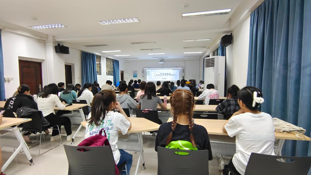 连选老师主要从就业形势、努力方向、决策行动三个方面详细讲述,带着同学们一起分析广西2022届本科生毕业去向,分别从企业需求角度和学生期待角度进行对比,就同学们感兴趣的“就业地点”、“应届生起薪”、“职业吸引因素”等内容展开讨论,就企业端看中的应届生背景和表现进行分析,提醒同学们要注重在校日常能力的培养。随后,连老师从大学生涯规划服务求职就业、境内升学、出国留学角度分别对大一到大四年级四个时期应注意的事项逐一讲解。最后连老师提出了“则己所爱、则己所能、择世所需、择己所利”四大黄金准则助力大学生做好规划。