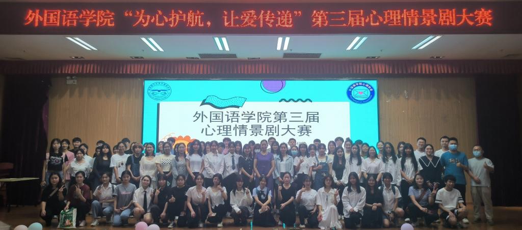 大赛前,主持人向评委和观众详细介绍了本次大赛设置的奖项和评比方式。随后,舒强老师做了比赛前的致辞。比赛中,演员们精彩用心的表演、绚丽的灯光和音效以及每个剧所要传达的深刻含义,都给观众与评委们留下了深刻印象。同时,比赛中途还进行了抽奖环节,在场观众们都积极地参与,将现场气氛推向了高潮。大赛的尾声,邓洁琼老师对比赛进行了点评。她指出每一个剧本都有出彩和精彩之处,都给出了高度评价,提出改进的建议。同时呼吁老师和同学们关注心理健康,呼吁更多的同学参与到心理情景剧的创作中,让心理情景剧大赛越办越好。经过激烈角逐,英语2021-4班《玫瑰上的蜂鸟》获得得本次大赛的一等奖;英语2022-1班《心障》与日语2022-2班《返璞归我》获得本次比赛二等奖;英语2022-5班《恋爱“焦”想曲》、英语2021-1班《悔》、英语2022-2班《破除枷锁》获得本次比赛三等奖;英语2022-3班《怯》与日语2021-1班《包容彼此,携手向前》获得优秀奖。最后,老师和全体参赛人员进行合照留念,比赛圆满落幕。