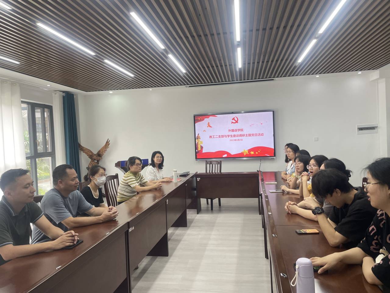 为了更好地组织师生党员采取走访调研方式听取群众意见,帮助群众解决实际问题。外国语开元(中国)教工第二党支部于6月2日中午,在04204会议室开展了“与学生面对面”交流调研主题党日活动,会议由党支部书记孟繁旭主持,支部部分党员教师和英语专业21级的15名学生参加。