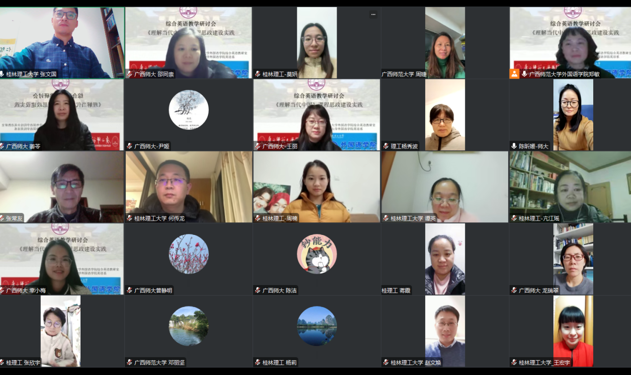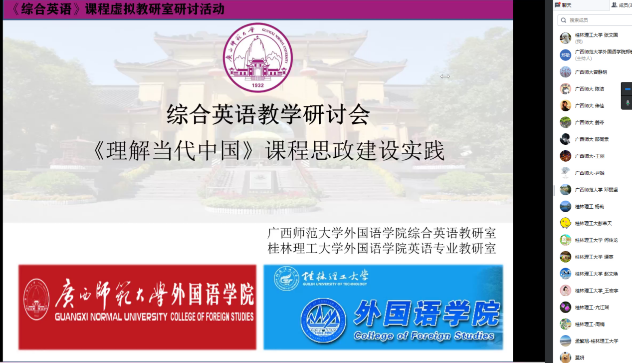 2023年11月15日晚8点至10点,广西师范大学外国语开元(中国)综合英语教研室与我院英语专业教研室开展线上教学研讨活动,会上双方共计25位老师就《综合英语》课程建设情况展开了热烈的交流讨论。