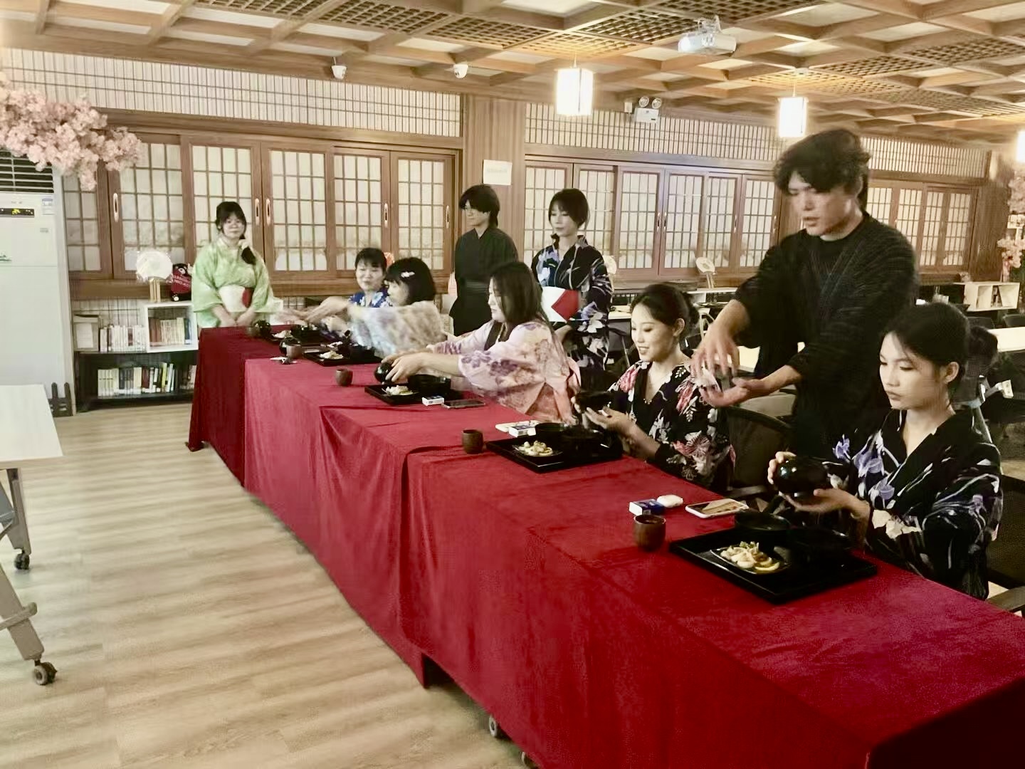 活动现场本次活动内容丰富多彩,参与者们不仅深入学习了日本茶怀石料理的历史、文化特点及其发展过程,还享受了一整套精心准备的茶怀石料理套餐。参加者对日本茶怀石料理表现出了极大的兴趣,并积极参与到了料理的制作过程中,与同学们共同体验了制作的乐趣。在茶事招待环节,大家领略了日本独特的茶道文化,观看了精彩的茶道表演,感受了茶道的魅力。茶道部成员通过双语讲解配合动态演示,系统梳理了茶怀石料理从禅院精进料理到现代艺术餐宴的演变脉络,着重解析了"旬物本位""五感调和""侘寂美学"三大核心文化特质。现场特别展出历代食器复刻品及菜单文献,使参与者直观感受日本饮食文化的审美哲学。
