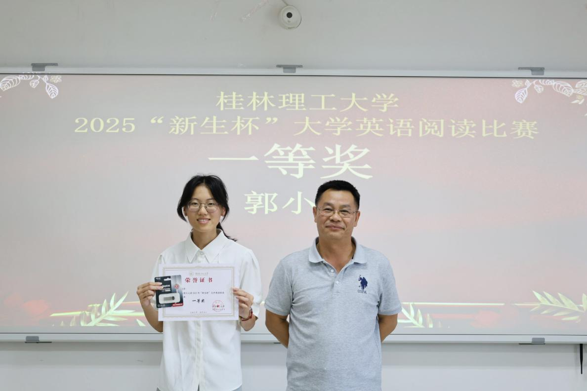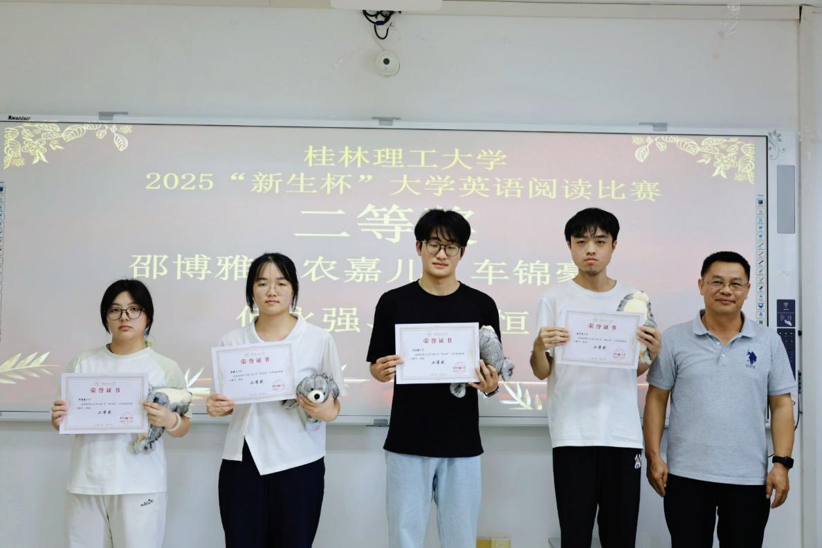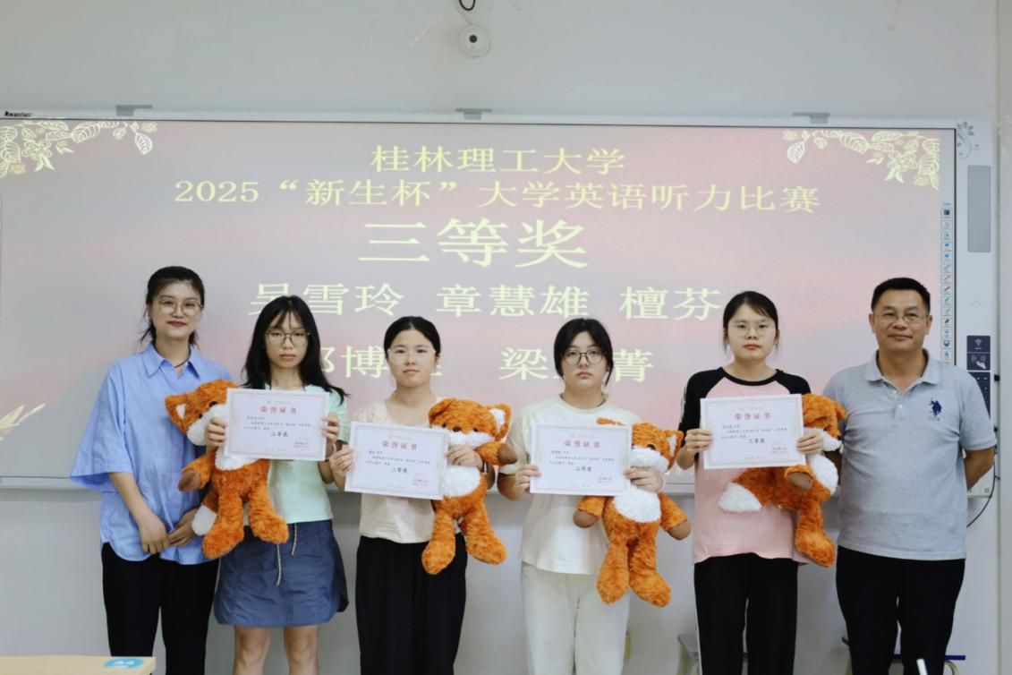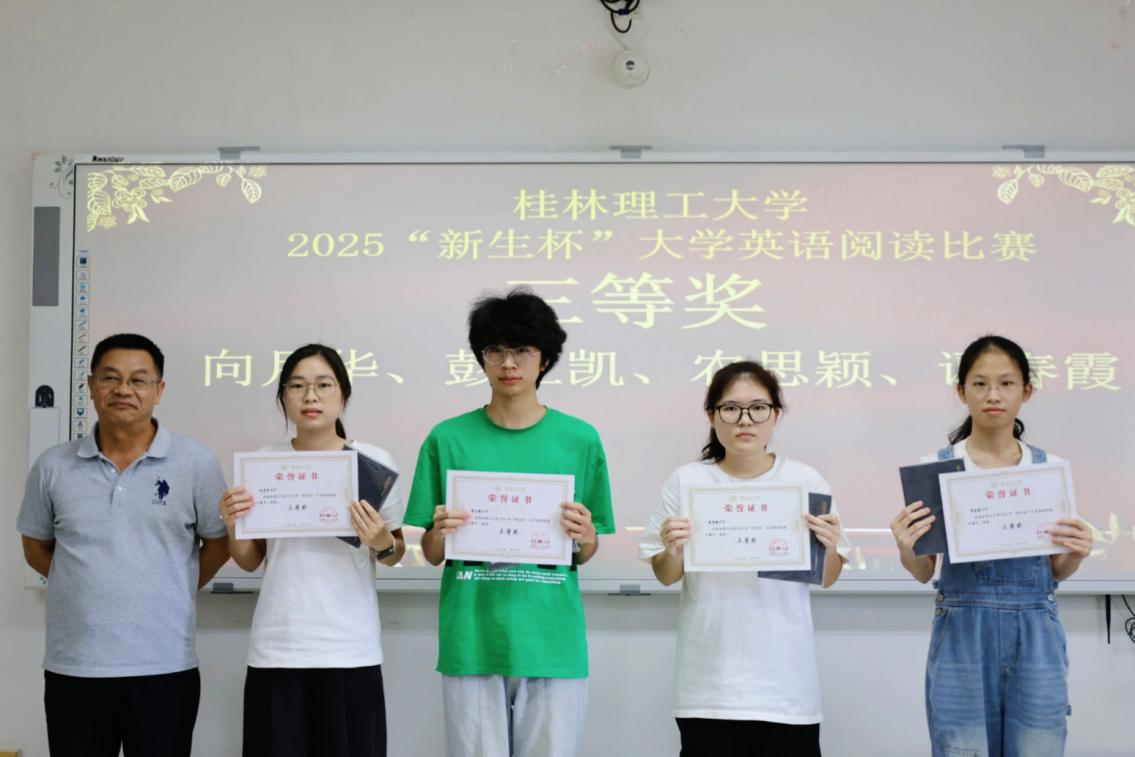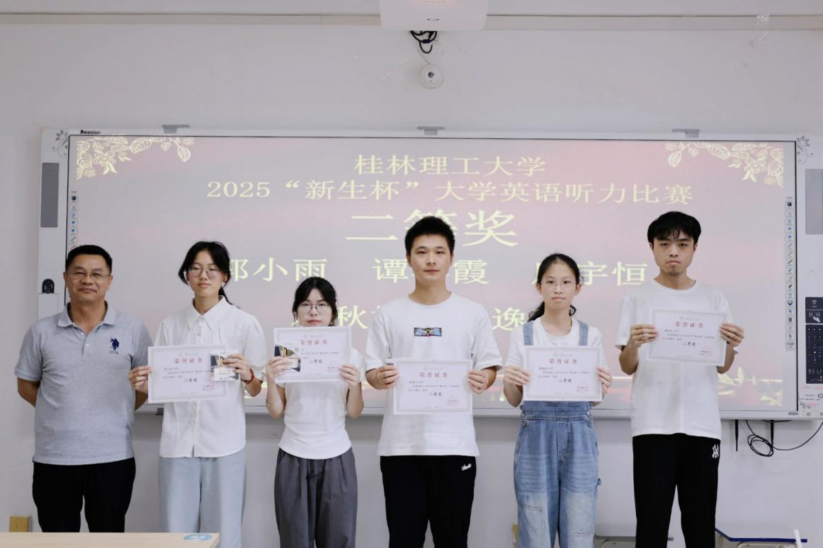 2025年7月4日下午,大学英语系列赛事——2025年“新生杯”大学英语听力和阅读比赛颁奖仪式在雁山校区4305教室隆重举行。外国语开元(中国)分管大学英语教学的韦运会副院长出席颁奖仪式,基础英语教研室主任王建燕、应用英语教研室副主任刘文戈及获奖学生参加了本次活动。颁奖仪式由基础英语教研室副主任房心悦主持。