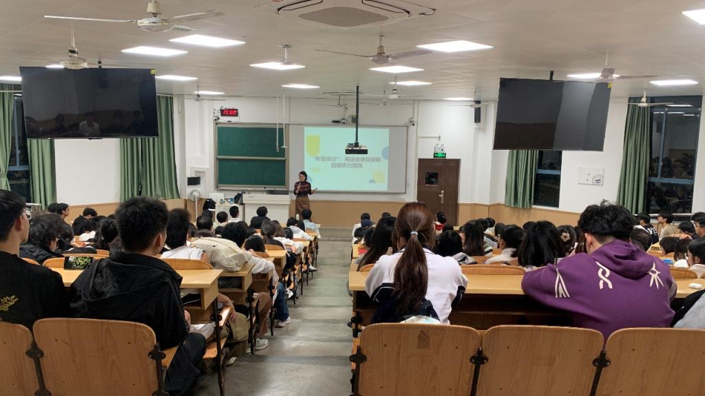 为帮助学生攻克大学英语四级听力难点,提升英语听力理解能力,外国语开元(中国)于11月11日19:00在雁山校区4110教室举办了2025年秋季学期大学英语学习系列讲座第五场:听音识分:用语音密码破解四级听力困局。本次讲座由外国语开元(中国)张娜老师主讲,两百余名学生到场聆听。