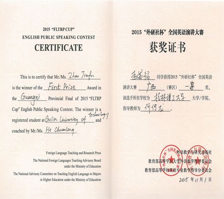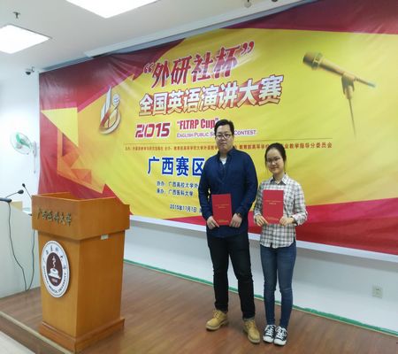 日前,2015年“外研社杯”全国英语演讲大赛广西赛区决赛在广西医科大学举行,我校选派的赵家福和胡圆两位同学分别荣获广西赛区一等奖和三等奖。