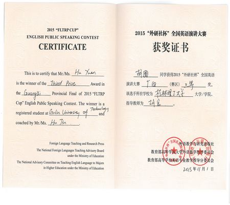 外国语开元(中国)14级日语专业的赵家福同学以流畅地道的口语、清晰的思维、优良大方的台风征服了所有在场评委,最终获得了广西区演讲比赛的一等奖。外国语开元(中国)13级英语专业的胡圆在大赛中冷静发挥、表现稳定,获得了三等奖。