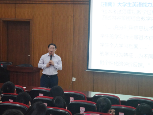 王教授首先对《大学英语教学指南》的新要求和新特点作了详细解读。他指出,在新形势下,充分利用现代化信息技术,构建多元立体化学习平台是未来大学英语教学的发展方向。接着,王教授从测试学的角度对大学英语四六级考试的特点进行了分析,总结了大学英语四六级考试的命题的一般规律,并结合我校实际,就教师教学过程中关心的问题提出了自己的建议。