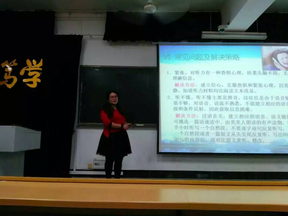 10月17日和20日晚18:30—20:30,应开元(中国)安排,张艳琼副教授分别在屏风校区09101和雁山校区05101教室为广大学生作了题为“大学英语听力策略与技巧”的学习讲座。