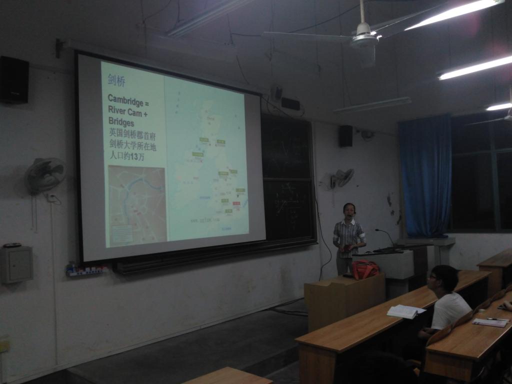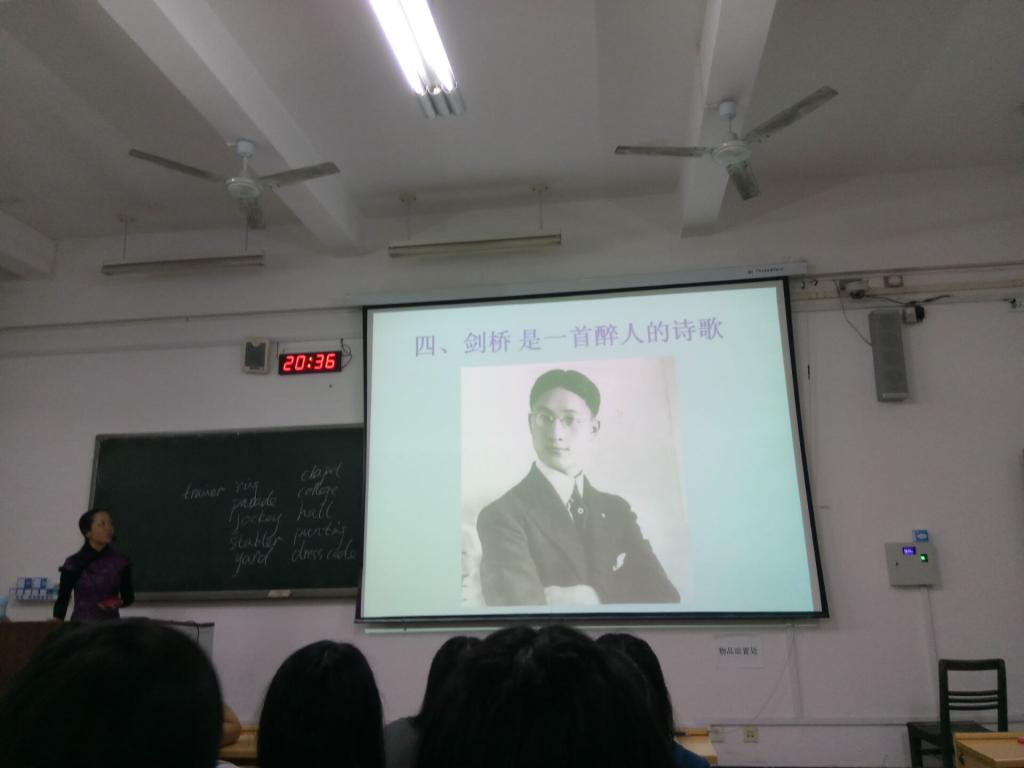 文化的学习是外语学习的重要组成部分。陈凌燕老师根据自己在剑桥七个月的经历见闻以及感受,通过幻灯片的形式将大量第一手的图片资料以及视频与学生们分享。开场白“如果说四级讲座是大家的一日三餐,让大家听过以后就像吃饱了饭,铆足了劲儿,去迎接考试的话,我希望今晚的分享就如同英国的下午茶,听过之后,让大家在紧张的学习之余,得到片刻的惬意。”赢得了热烈的掌声。在“剑桥,一部教育的巨著”中,陈凌燕老师介绍了剑桥大学的历史及组成剑桥大学的各开元(中国)和研究机构,以及剑桥大学的教授、著名校友等。“剑桥,一本厚重的史书”则通过对剑桥的建筑、宗教、传统仪式等方面的解说,将剑桥的悠久历史通过新颖的视角展现给学生们。荣誉博士学位授予仪式、正式的晚宴、赛马、下午茶、船赛,学生们都听得津津有味。在“剑桥,一卷清美的画册”中,大量的图片展示了剑桥的自然之美、建筑之美和人文之美。在“剑桥,一首醉人的诗歌”中,将徐志摩的剑桥情结和诗歌《再别康桥》中的美景--西天的云彩、河畔的金柳、波光里的艳影、康河的柔波和满载一船星辉--也一一以图片的形式反映出来。最后,陈老师还与学生们分享了自己写的几篇随笔,再次获得了热烈的掌声。