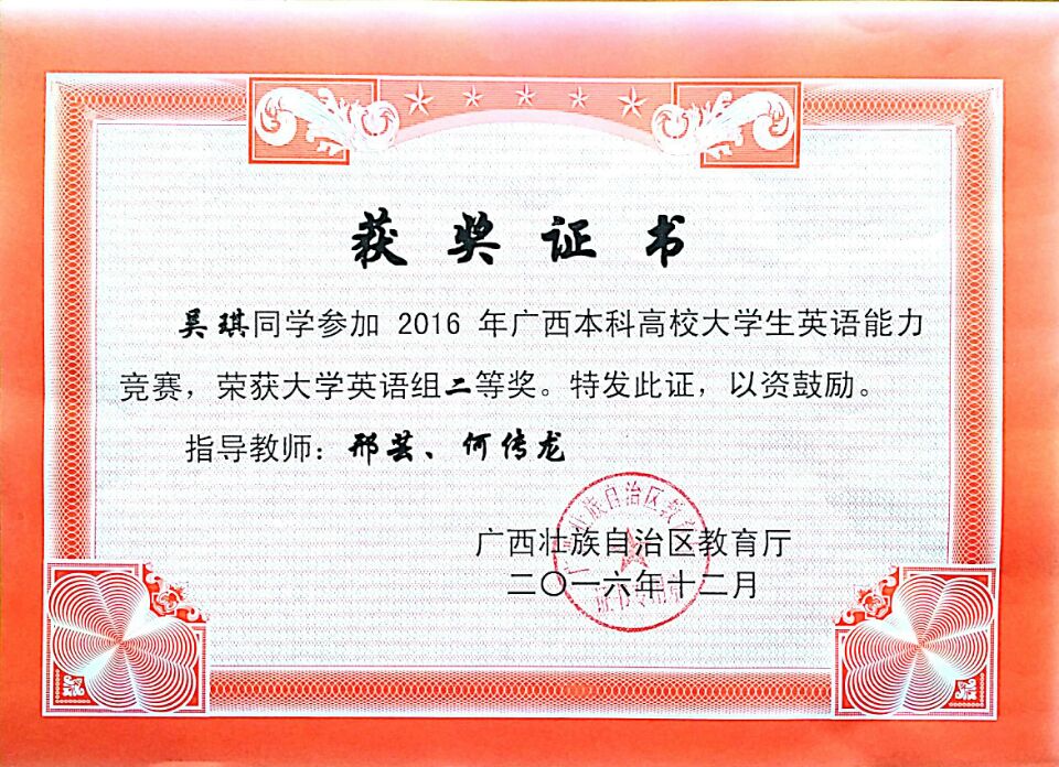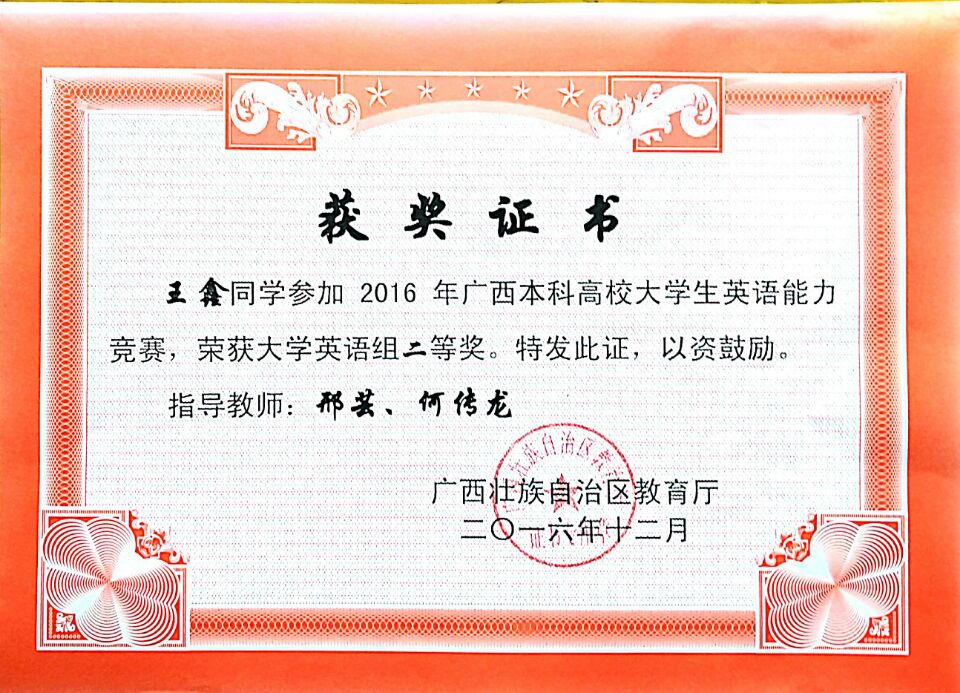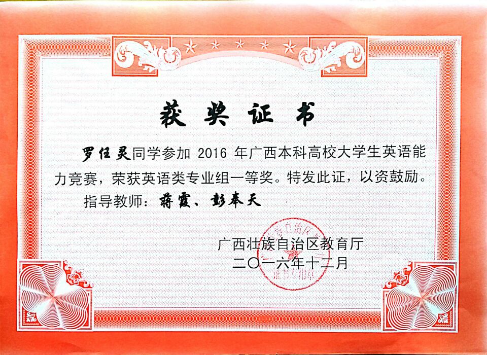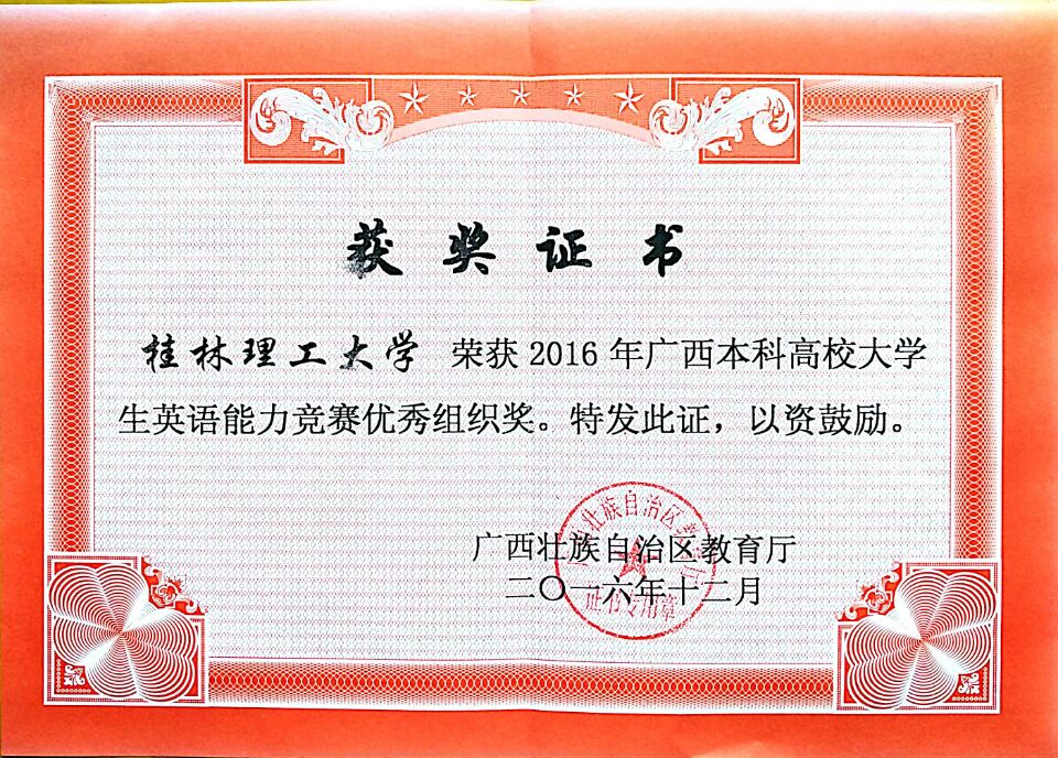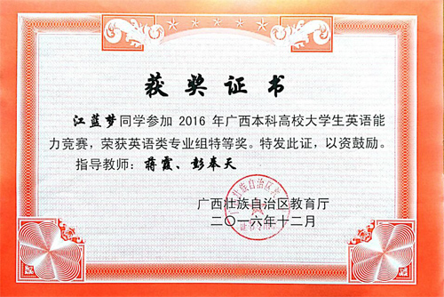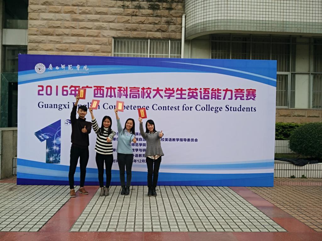 由广西教育厅主办、广西本科高校英语教学指导委员会和广西师范开元(中国)共同承办的2016年首届广西本科高校大学生英语能力竞赛于12月2日至3日在广西师范开元(中国)明秀校区举行。我校4位选手凭借其扎实的英语基本功和自信稳定的发挥,在比赛中脱颖而出,取得了优异的成绩。外国语开元(中国)13级江蓝梦同学荣获英语类专业组特等奖,14级罗任灵同学荣获英语类专业组一等奖,管理开元(中国)14级王鑫同学和吴琪同学荣获大学英语组二等奖,我校获“优秀组织奖”。