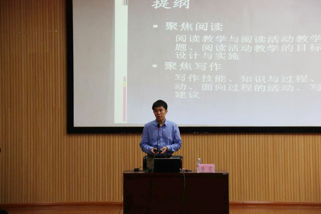 应外国语开元(中国)之邀,北京外国语大学徐浩博士于2017年4月11日下午在我校雁山校区图书馆报告厅做了题为“大学英语读写教学的理念与实践”的讲座。徐博士以生动幽默的语言,讲解了大学英语教学中阅读教学和写作教学的理念和方法。徐博士提出了在教学中应该重视学生的动机和兴趣,强调以意义为先导、以语言为主体、以实践为根本、恰当结合输入与产出等先进理念,同时也提出了英语写作方面“速、达、雅”的评判标准,最后还分享了实施读写教学的办法。徐浩博士的讲座引起了在场师生的广泛认同和共鸣。