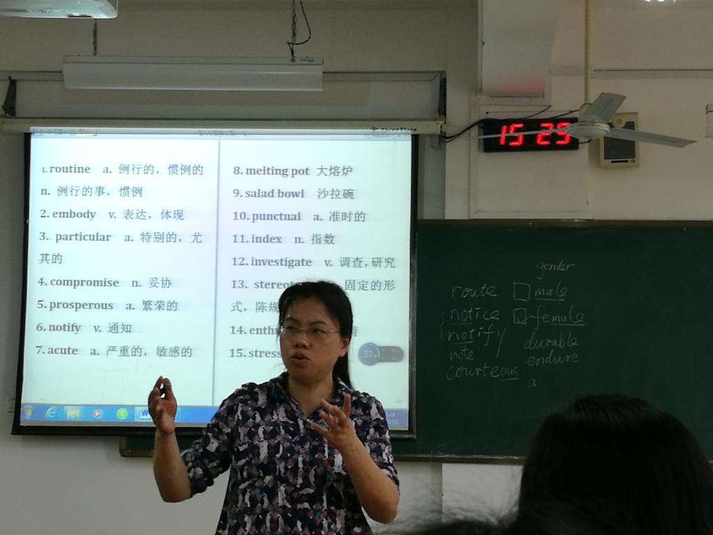 公开课的主讲人是教研室主任彭惠玲老师。上课的前五分钟,彭老师检查了学生的作业完成情况并作了记录,作为评定平时成绩的依据之一。然后,通过听写检查学生记忆词汇的情况,听写完后,采用语境学习法和词根教学法,逐一分析所听写的词汇,帮助学生掌握记忆词汇的方法。最后,点评了学生使用itest、iwrite和fif 三个系统的情况,对没有完成任务的学生点名批评,表扬了完成得好的同学,督促大家转变思想观念,努力转变学习方式,从传统的纸质学习转向纸质学习与网络学习相结合。
