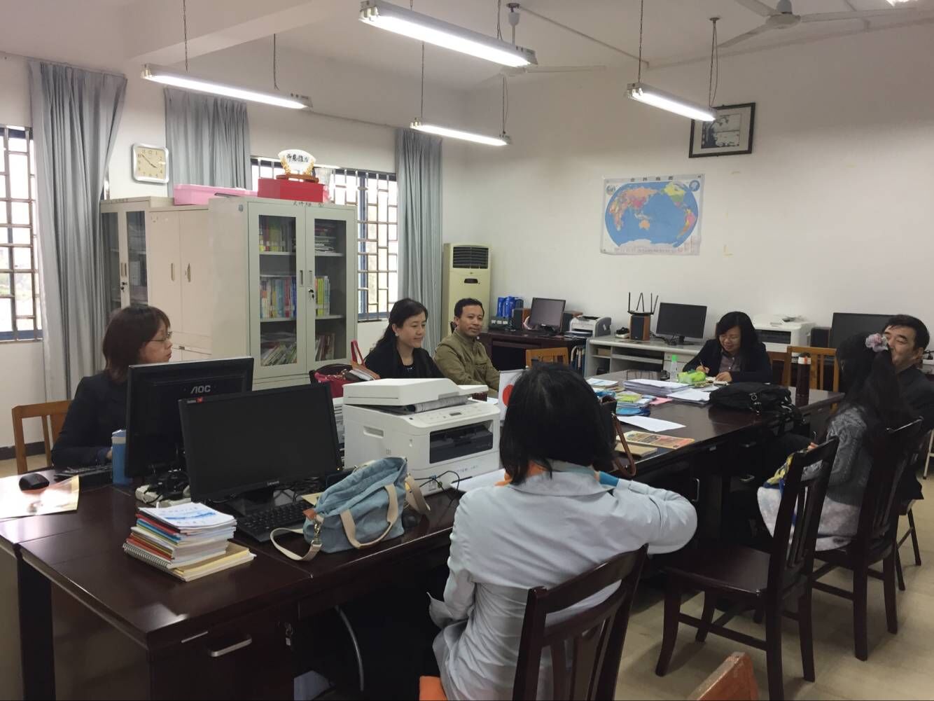 11月14日,日语教研室全体教师聚集在雁山04316办公室,围绕正在开展的期中教学检查工作进行自查,会议由教研室主任覃霄老师主持。