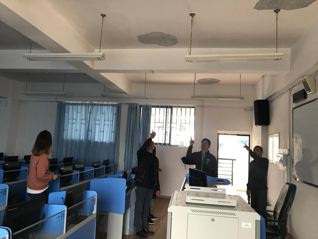 会上,实验室主任韦祖巧老师总结了上学期工作,以及本学期的实验室工作任务。随后对雁山、屏风两校区所有实验室进行了设备检查、室内卫生清洁,排查可能存在的安全隐患,特别查看了04207、04320、04322、04405、044407这五间视听训练室的天花板腻子脱落问题,确保新学期正常教学。