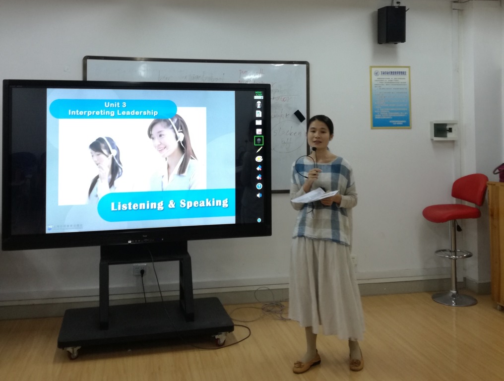 首先是钟韫霞老师向大家展示《综合教程》第三单元的教学思路。钟老师全程英文说课,教案思路缜密,课件内容详实,教师讲授与学生练习均衡分配。教案设计不仅注重学生人文素质培养,同时也结合学生过四六级的需求,注重基础知识的传授、巩固和积累,针对学生基础普遍薄弱的特点,以难度适中的教学环节来帮助学生夯实英语基础。