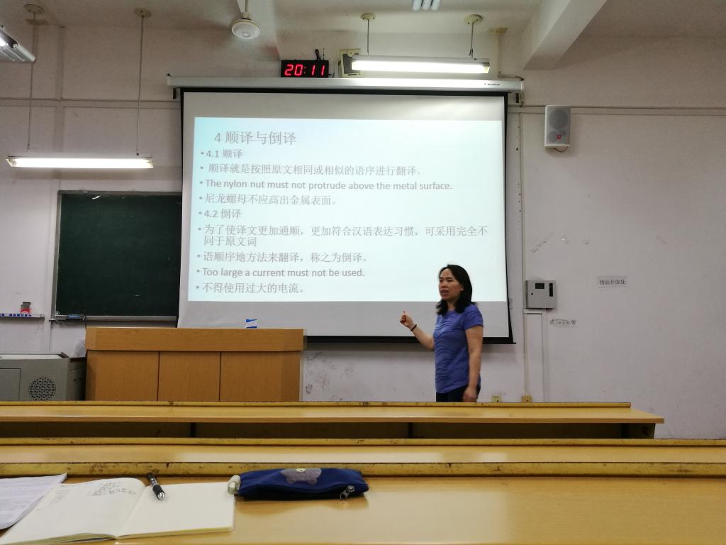 李老师首先对科技英语的文体特点进行说明,然后再根据其文体特点,提出科技英语的翻译标准应该是:“准确规范,通顺易懂,简洁明晰” 。接着给同学们讲解了这种类型文体的翻译方法:直译与意译、分译与合译、增译与省译、顺译与倒译。最后李老师还告诉大家,作为一名合格的译员,不仅要有较高的英语水平、汉语水平和专业知识,还要具有丰富的翻译知识和翻译经验。