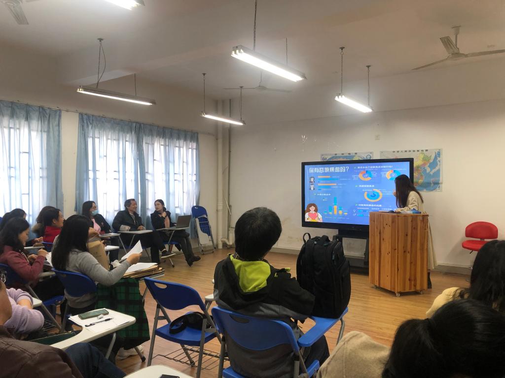 其次,陈芳老师组织全体教师进行集体备课,特别强调教师要深入挖掘课本中富有人文内涵和课程思政的语言内容。把大学英语教学目标与课程思政的育人目标对接,抓住每个单元思政点,融入课题,融入语言。结合单元主题,从现实问题入手,锁定社会主义核心价值观和中国文化价值观,来设计教学方案,组织教学活动。引导学生以口头或书面语言使用英语来描述问题,分析问题。培养学生的语言综合运用能力和思辨能力的同时,润物无声进行思政教育。最后凌琳老师介绍第一单元的教学活动设计。凌琳老师就课前导入、课文讲解、课后练习及课程思政等四大部分介绍了教学安排和活动设计。随后,老师们就教学设计、课程思政与四六级备考发表观点,提出建议。