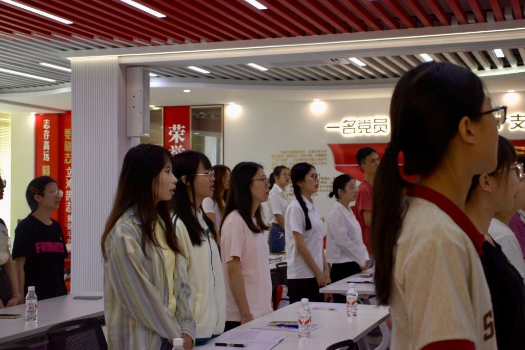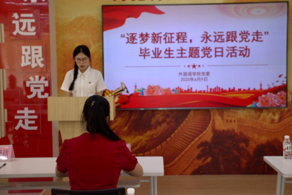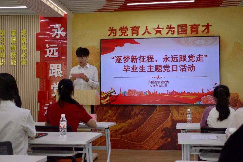 为加强毕业生党员的纪律意识和责任担当,激励他们在未来的人生道路上继续发扬党的优良传统,为实现中华民族伟大复兴的中国梦贡献力量。我院于6月9日上午在思政大讲堂成功举办了“筑梦新征程,永远跟党走”毕业生主题党日活动。本次活动由外国语开元(中国)党委副书记,本科生第一党支部书记邓洁琼老师、曾燕老师、蒋贤洁老师以及2025届毕业生党员共同参与。