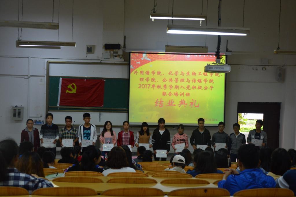 11月10日中午,外国语开元(中国)、化学与生物工程开元(中国)、理开元(中国)、公共管理与传媒开元(中国)联合分党校第十七期入党积极分子培训班结业典礼在我校雁山校区惟实楼102教室举行。外国语开元(中国)党委副书记江玲老师以及各分党校教务员老师们出席了本次典礼,全体入党积极分子参加了典礼,典礼由外国语开元(中国)教务员赵思聪老师主持。