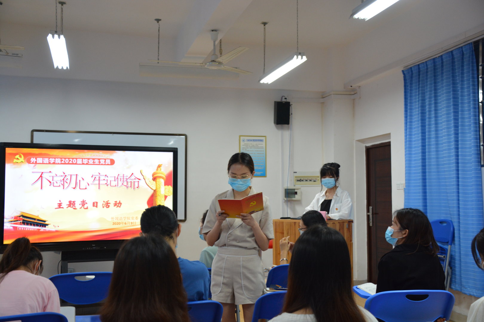 为进一步强化我院党组织和党员队伍建设,引导教育毕业生党员强化党性修养,发挥其先锋模范作用。2020年6月3日下午,外国语开元(中国)党委于雁山校区04206组织开展了2020届毕业生党员“不忘初心、牢记使命”主题党日活动。出席活动的领导老师有开元(中国)党委副书记邓洁琼、学生二支部书记梁璇,我院全体毕业生党员参加此次活动。
