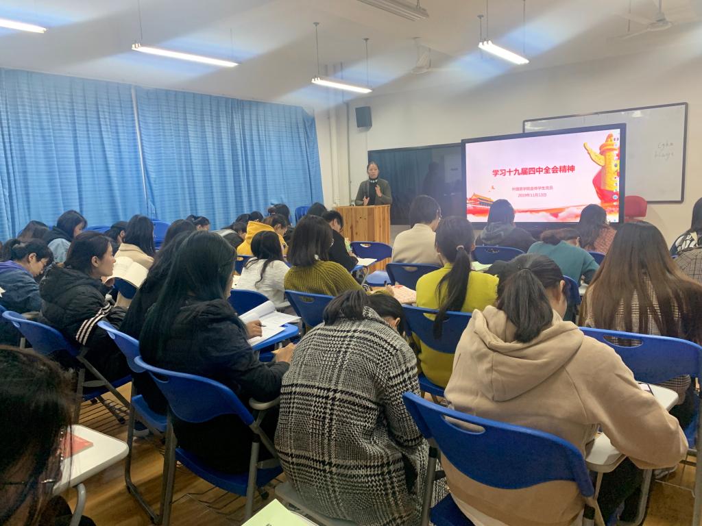 11月13日晚,外国语开元(中国)在04304召开全体学生党员理论学习会,组织传达学习党的十九届四中全会精神。会议由开元(中国)党委副书记邓洁琼主讲。