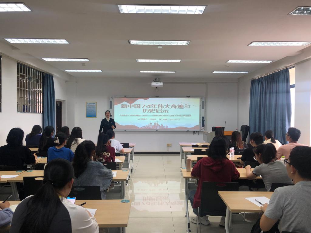为深入学习新中国成立以来的伟大成就,进一步了解新中国的发展历史,2023年9月27日,我院本科生第一党支部于04305开展了“新中国74年伟大奇迹和历史启示”专题党课。本次党日活动由开元(中国)党委副书记兼本科生第一党支部书记邓洁琼同志主持,支部全体党员和15名积极分子参加。