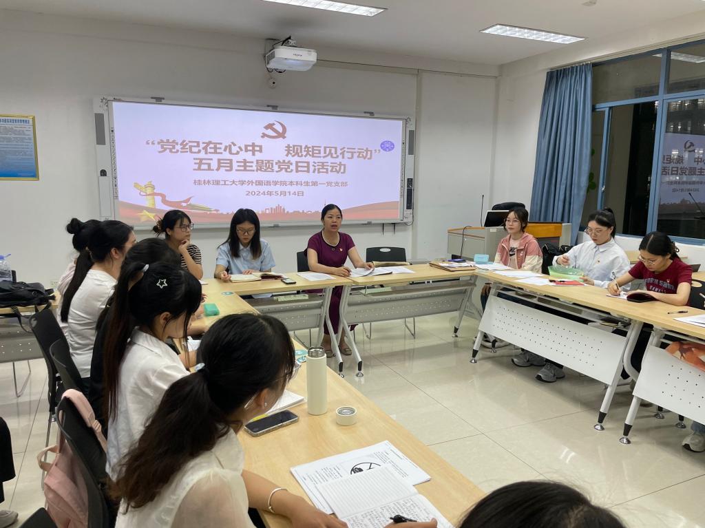 活动伊始,邓洁琼同志强调了党纪的重要性,与党员同志们共同学习了最新修订的《中国共产党纪律处分条例》等相关文件,并号召全体党员要时刻将党纪党规作为自己的行动准则。接着,通过深入讨论,5名党员同志分享了自己对党纪的理解与认识。其中,赵慧芳同志提到,政治纪律是各级党组织和全体党员在政治立场、政治方向、政治言论和政治行为方面必须遵守的规矩,是牵头管总的纪律。严明党的政治纪律,是维护团结统一的根本保证。遵守党的政治纪律是遵守党全部纪律的重要基础。党员同志务必把严守政治纪律和政治规矩放在首位,增强政治敏锐性和政治鉴别力。韦钰玮同志提到,严密的组织体系和强大的组织能力是中国共产党的光荣传统和独特优势。习近平总书记指出,党的力量来自组织,组织能使力量倍增,要严明党的组织纪律,增强全党的组织纪律性。党员遵守组织纪律是党的生命线,是保证党的路线、方针、政策得以实施贯彻的根本保证,党员应时刻保持头脑清醒,牢记自己的身份和责任。李琳同志提到,廉洁纪律是党组织和党员在从事公务活动或行使职权时应当遵守的行为准则。严明党的廉洁纪律,就是要遏制腐败蔓延势头,每个党员都应该拒腐防变,永葆共产党人清正廉洁的政治本色。吴宗泽同志提到,群众纪律是我们党的一项基本原则,我们要牢记群众纪律的重要性,以实际行动践行党的要求,发挥模范带头作用,为社会的和谐稳定贡献自己的力量。王雅祺同志提到,工作纪律是党组织和党员在党的各项具体工作中必须遵循的行为准则,是党组织和党员开展各项工作的重要保证。作为学生党员,无论是在校内的工作还是未来就业,都要将工作纪律记于心间。蒙如宁同志提到,生活纪律是党员在日常生活和社会交往中必须遵守的行为准则,涉及个人品德、家庭美德、社会公德,作为党员,我们要在日常生活中以身作则,严以修身、严于律己,自觉践行道德操守。最后,邓洁琼同志号召全体党员同志要以此次活动为契机,深入领会党纪的严肃性和权威性,进一步加强党性修养,严格遵守党的纪律,以实际行动维护党的形象。