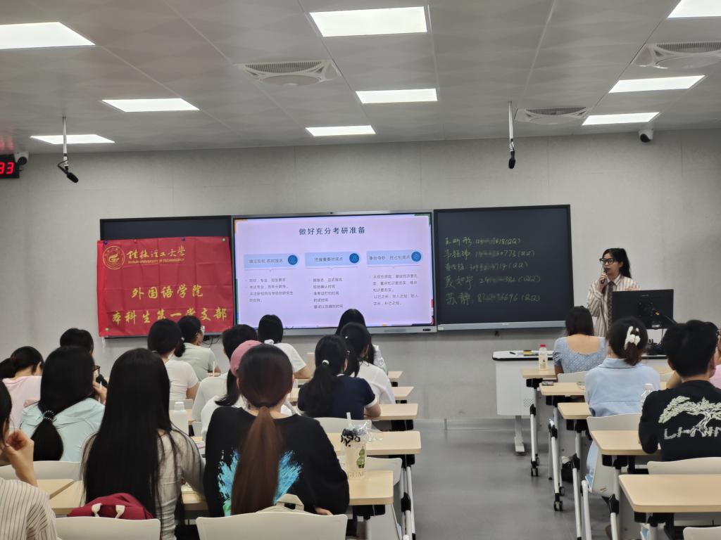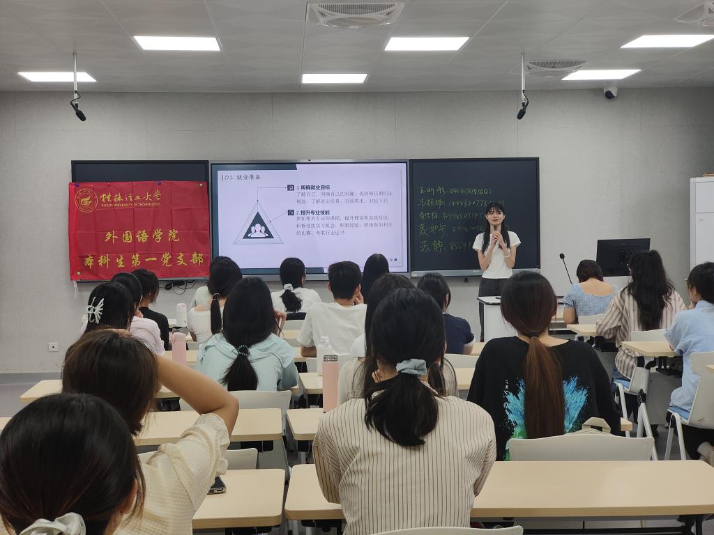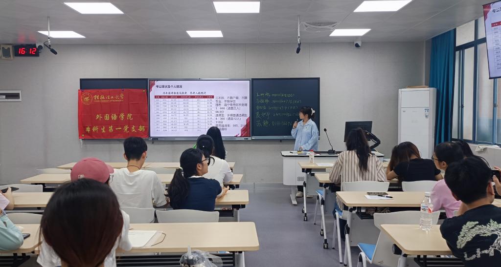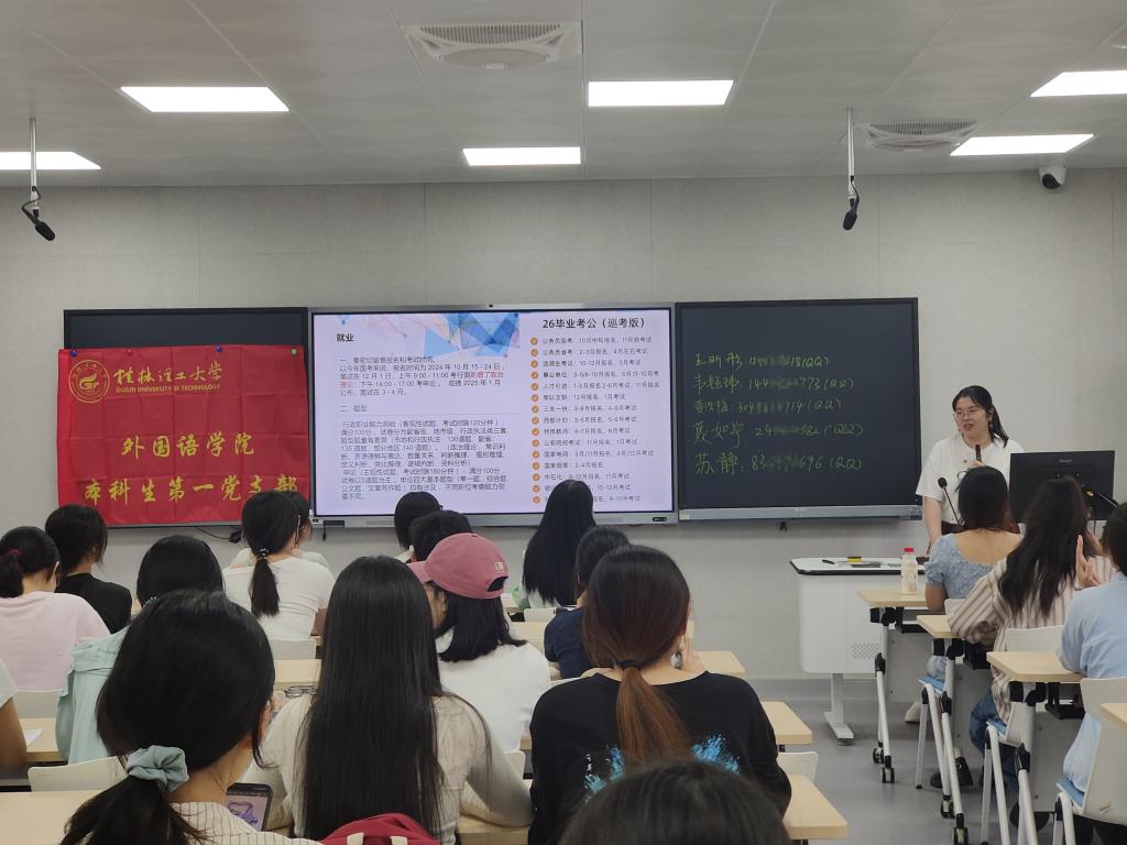 活动筹备阶段,外国语开元(中国)本科生第一党支部精心设计分享方案,明确分工,确保分享内容兼具针对性与实用性。分享会上,黄沿梅、韦钰玮、林依然三位同志围绕考研主题,分别从院校与专业选择、复习规划、心态调整等方面进行深入分享,并分享了克服惰性、提高备考效率的方法。苏静、王昕彤、蒙如宁三位同志则聚焦就业与毕业论文,从求职经验、行业选择、简历制作、面试技巧等角度进行具体分享,并梳理了毕业论文写作中的常见问题与应对策略,强调早规划、重落实的重要性。