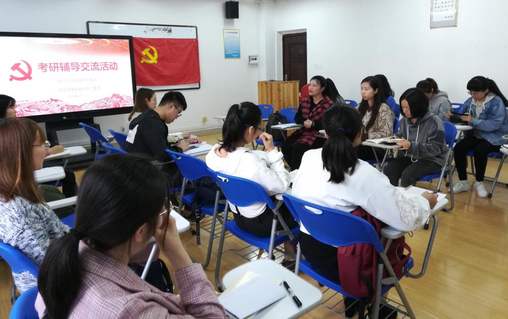 为进一步贯彻落实党的十九大精神和提高“三会一课”的质量,同时促进基层党支部之间的交流,增强考研氛围,在支部内建设积极向上的学风。2019年4月16日,我院研究生党支部和学生第二党支部在04206活动教室开展了以“考研辅导交流”为主题的“三会一课”示范观摩学习交流活动。出席本次会议的有研究生党支部书记梁天秦同志和学生第二党支部书记梁璇同志,两个支部全体学生党员参加本次会议,学生第一党支部和教工党支部的支委到场观摩学习。