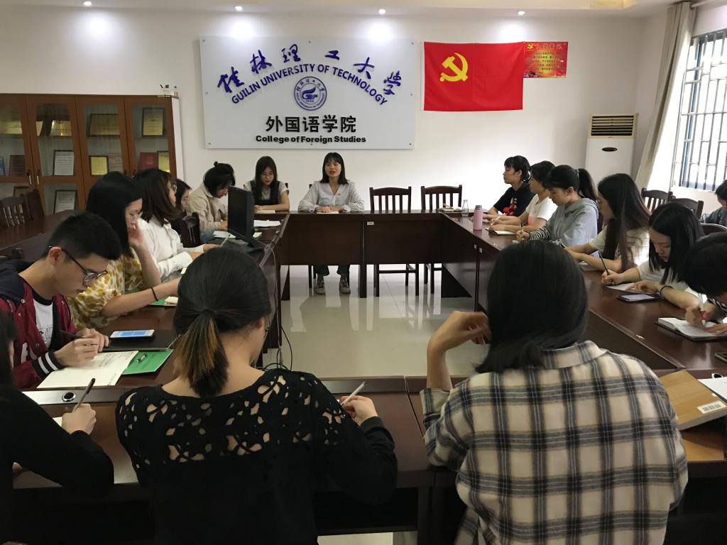 5月21日下午,我院学生党员一支部在雁山校区致远楼204会议室开展主题党日活动,专题学习以爱国主义为核心的五四精神,我院学生党员一支部全体成员参加,会议由支部副书记黄荣婷同志主持。