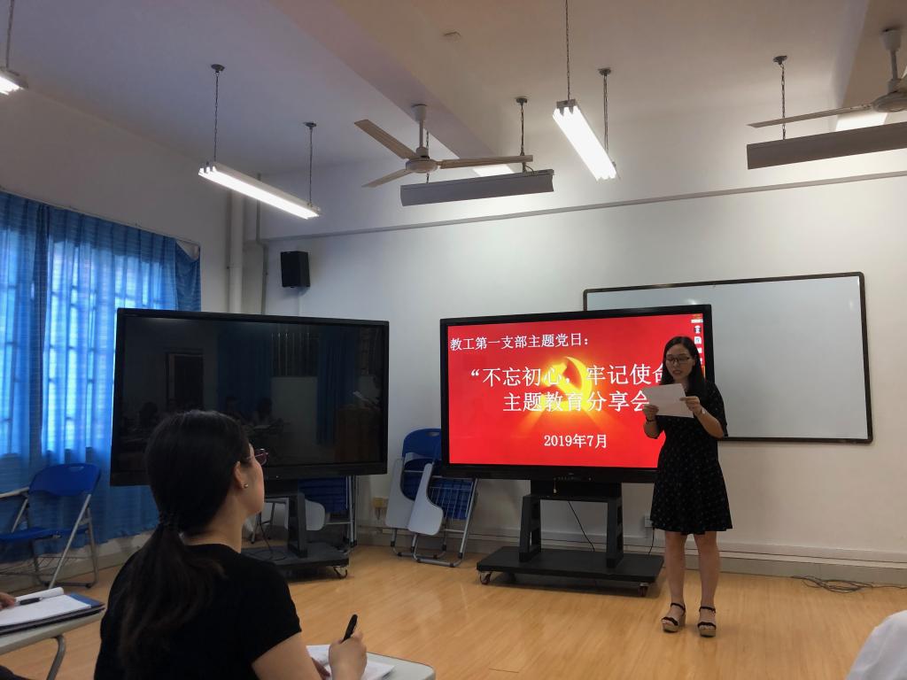 党员教师代表围绕“不忘初心、牢记使命”的主题分享了自己的心得体会。周萌同志表示教师的一言一行潜移默化地影响着学生,所以教师要做好教书育人的本职工作,在自己的岗位上坚守初心,牢记教书育人的使命,才能培养出优秀的大学生。谭艳菊同志总结了自己入党后的工作情况,讲述了党组织在日常教学和科研工作方面给予她的鼓励和启示,表示自己的成绩离不开党组织的关心和帮助。刘琼同志讲述了自己与学生相处的点点滴滴,特别是作为党员教师要更严格地要求自己和不断地提升自己才能更好地服务学生。同时,刘琼同志还分享了黄文秀同志的先进事迹,号召与会党员要向黄文秀同志学习,做好自己的日常工作,坚守初心,勇于担当,认真践行自己的使命。