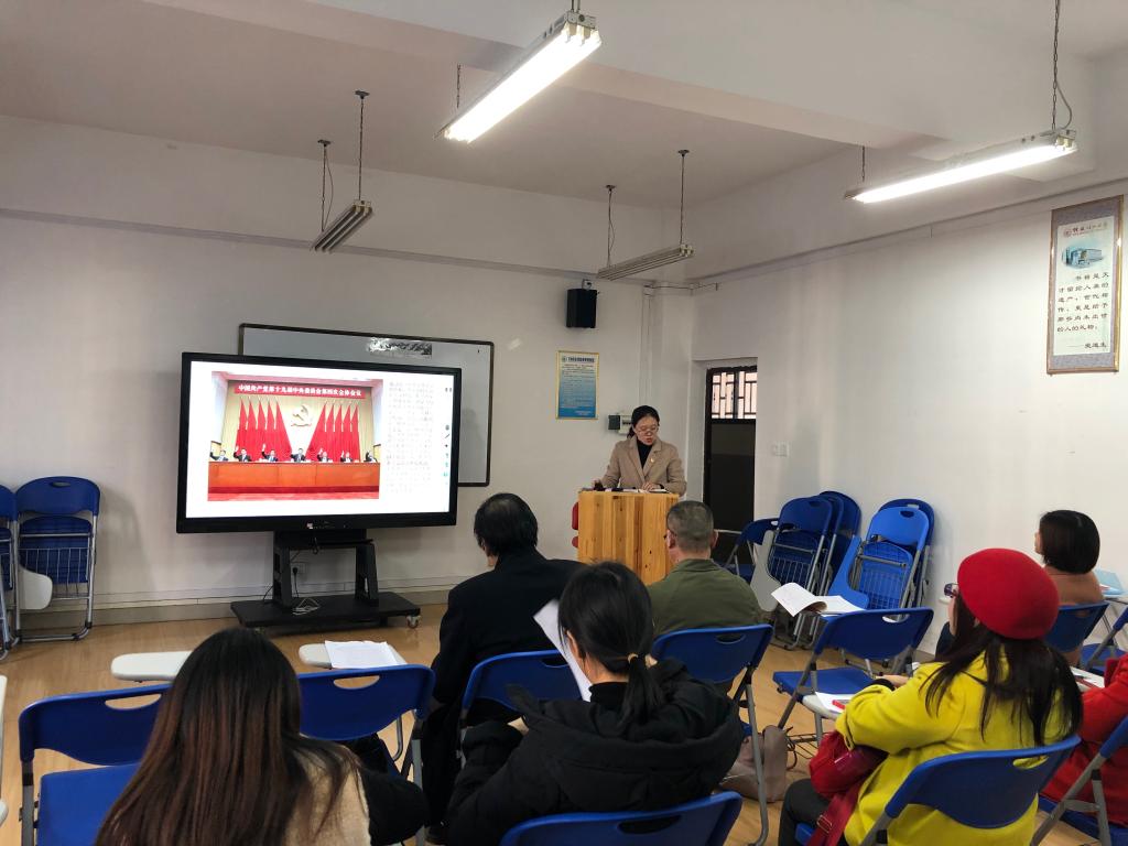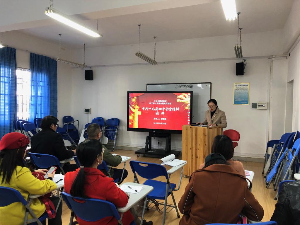12月10日下午,我院教工一支部党员同志在雁山校区04206教室参加了主题党日学习活动,支部组织委员曾曙静同志通过PPT分享的方式向与会党员讲解了中共十九届四中全会精神。本次主题党日活动由支部书记张华同志主持,外国语开元(中国)党委书记谢济光同志以普通党员的身份参加了本次活动。