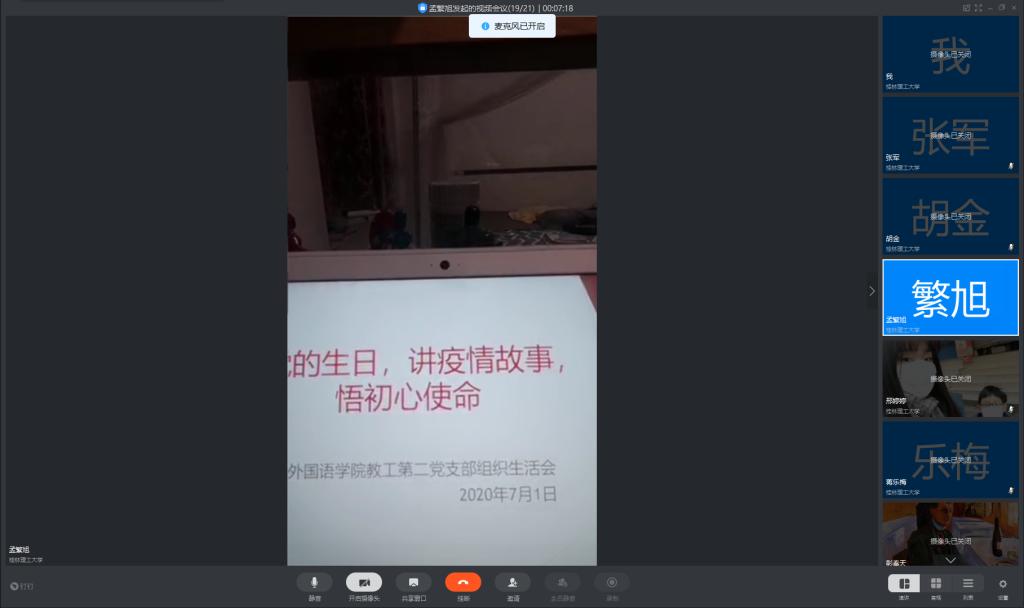 为庆祝中国共产党建党99周年,7月1日晚20:00,我院教工第二党支部以钉钉在线会议的方式开展“迎党的生日,讲疫情故事,悟初心使命”主题党日活动。本次活动由二支部书记孟繁旭主持,支部党员教工参加本次在线活动。