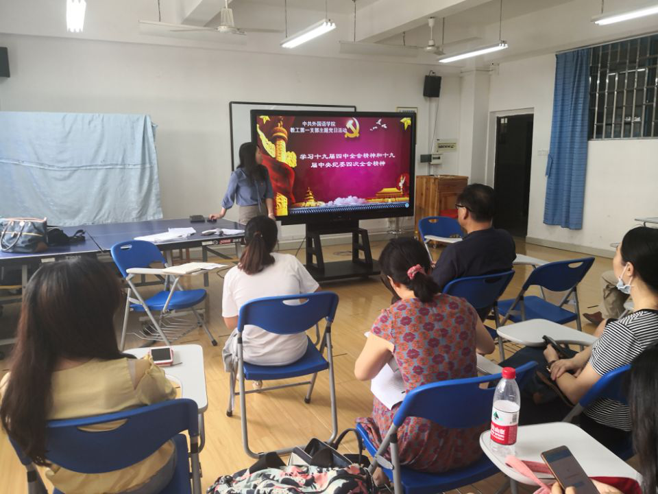 2020年7月2日上午,我院教工一支部党员同志在雁山校区04304教室参加了参加主题党日会议,集体学习党的十九届四中全会公报。此次主题党日会议由支部书记陈劲波同志主持,外国语开元(中国)党委书记谢济光同志以普通党员的身份参加了此次会议。陈劲波同志通过图文的方式,从会议时间、参加人员、会议内容显著优势、总体目标、工作要求等五个方面解读十九届四中全会公报精神。