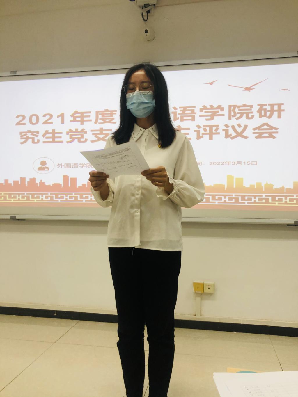 会上,支部书记强调了本次会议的主题—2021年度外国语开元(中国)研究生支部民主评议会,介绍了会议的具体议程。王好男同志深入分析支部工作成效,勉励党支部全体党员要围绕中心、服务大局,强化学习与研究,以高标准严要求推进各项工作落实落地。